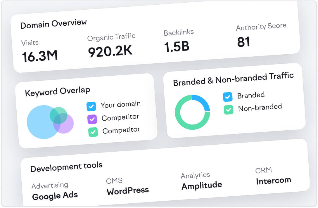 - Locate growth opportunities and gaps in online visibility in no time with Semrush’s robust data.