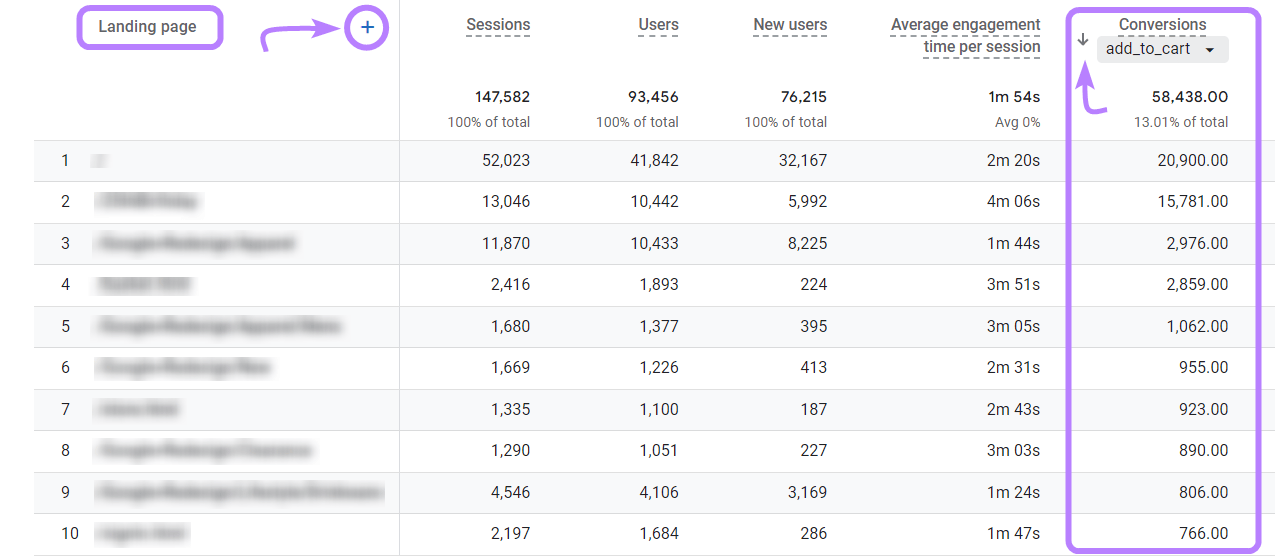You’ll see a report of your top landing pages sorted in descending order by sessions. Instead of sorting by sessions, click the arrow to the left of "Conversions" to sort.
