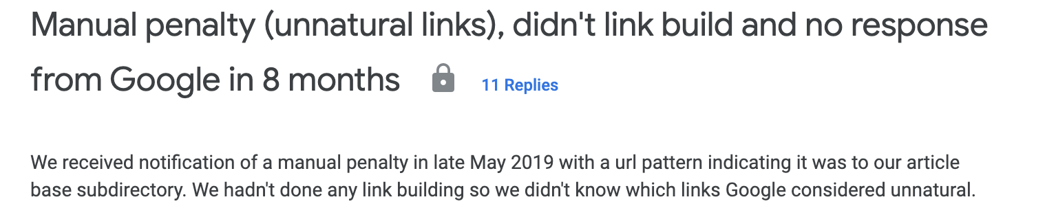 The above thread concerning difficulties in getting a manual action removed was posted in Google Search Console Help. Click to see the thread.