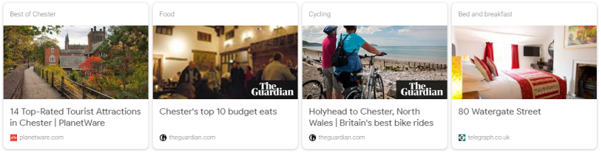 The immediate thing you will notice in the travel articles is that Google uses well respected and authored sites; I have yet to find an area that displays a random blog page from a hotel or local business. In the UK, Google tends to use large publications with very detailed travel sections and niche travel sites. They also bring in a range of articles covering a best of list, food, activities, hotels, and points of interest.