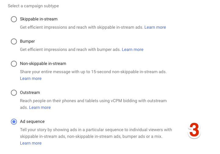 3. For the campaign subtype, select Ad sequence.